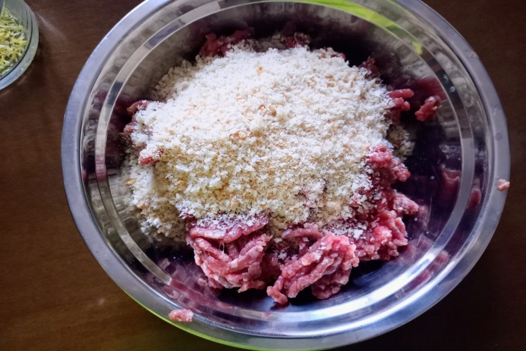 • Doe het gehakt in een kom en voeg het broodkruim en de geraspte grana toe.