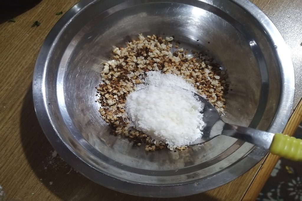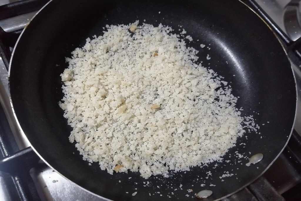 • Doe het brood in een kom en voeg de pecorino romano en een beetje fijngehakte knoflook toe.