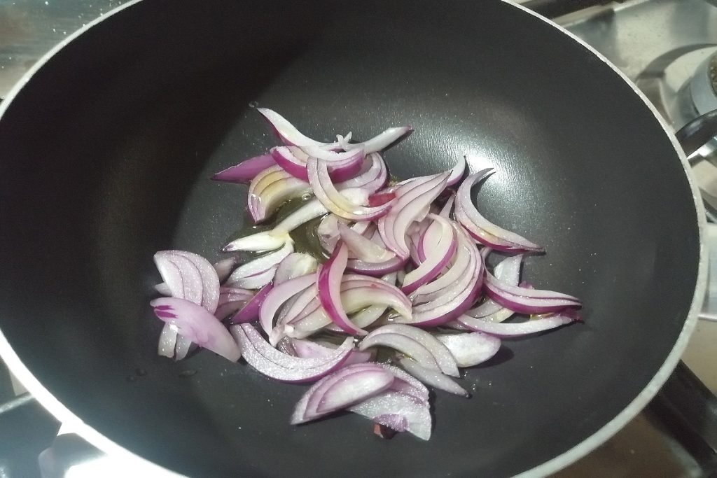 Verhit de extra vergine olijfolie en de gesneden ui in een pan, laat deze zachtjes fruiten op laag vuur.