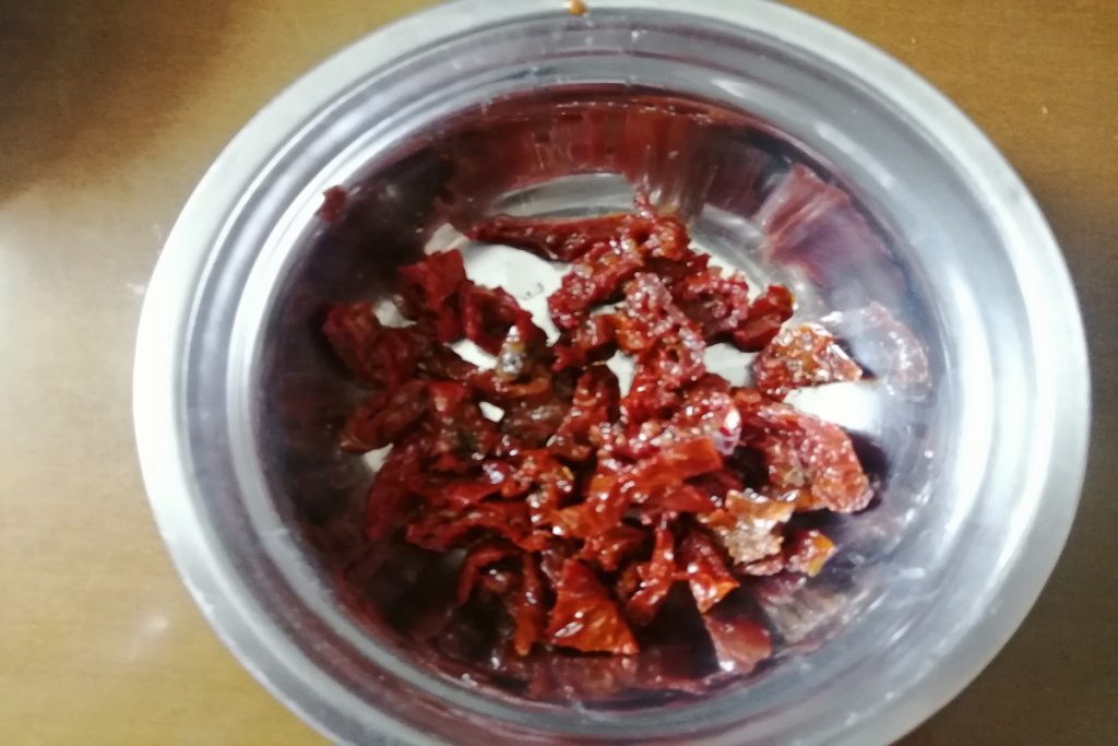 Giet wat extra vergine olijfolie in een pan en laat een teen knoflook bruin worden, voeg de gedroogde tomaten toe en laat 3-4 minuten koken terwijl je roert.