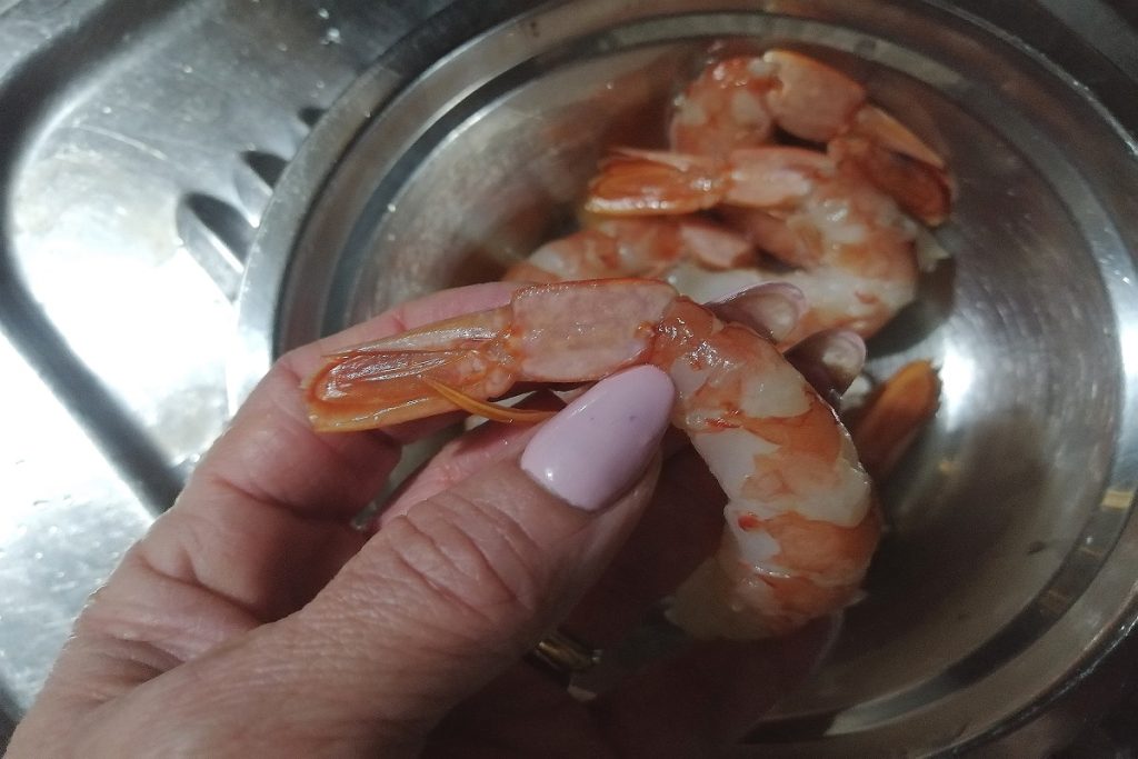 We beginnen met het schoonmaken van de garnalen door de kop te verwijderen en de darm te trekken, schil ze en laat het laatste deel van de staart eraan zitten.