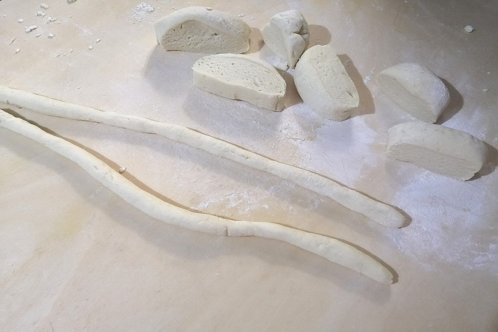 Rol de stukjes over het gnocchiplankje.