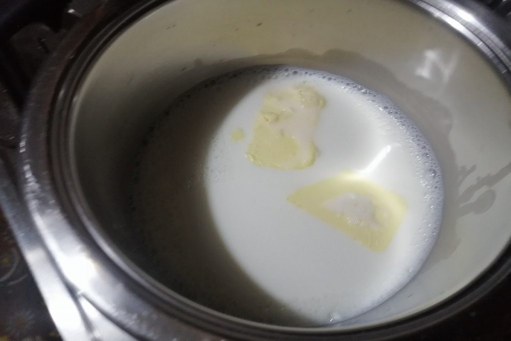 Giet de melk in een steelpan, voeg de boter, het zout en het theelepel plantaardige bouillonpoeder toe.