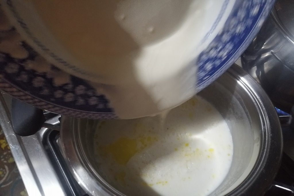 Wanneer de melk kookt, giet de pap erin en meng met een garde tot het dikker wordt, zet het vuur uit.