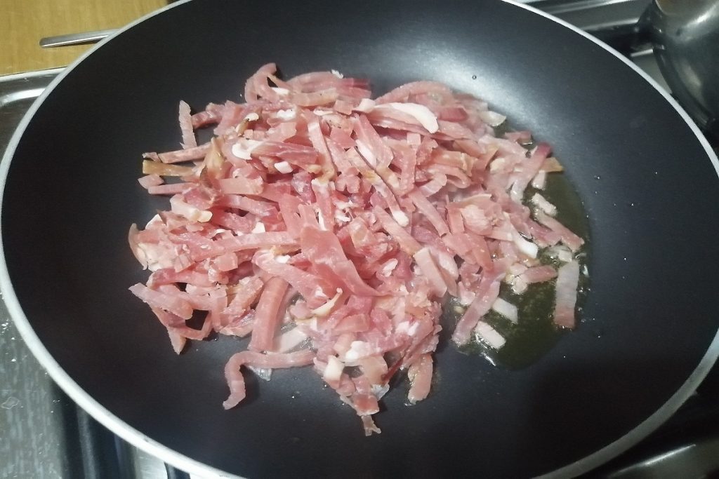 In een anti-aanbakpan, giet een beetje olijfolie EVO en voeg de spekreepjes toe.