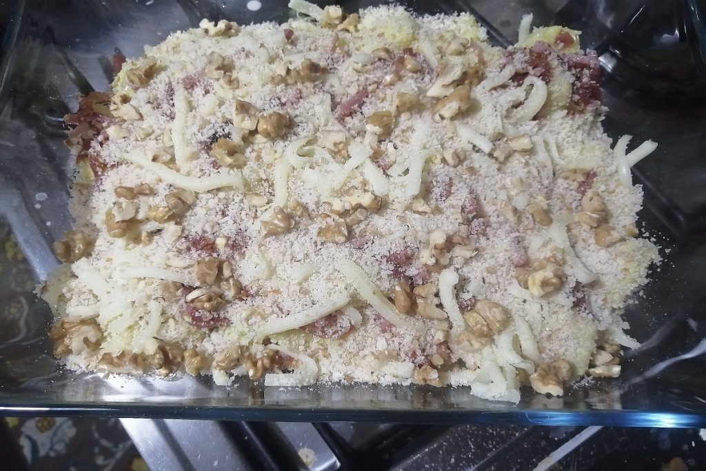Tot slot worden ze gegratineerd met een beetje broodkruim en gehakte walnoten, om een uitnodigende en smakelijke gouden korst te geven.