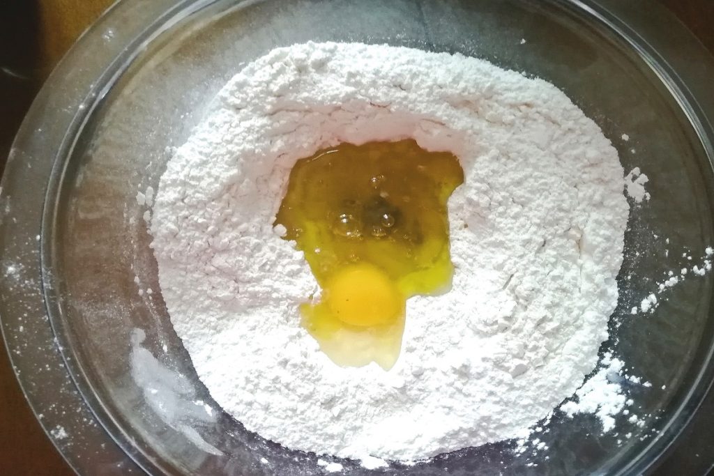 In een kom gieten we de bloem en in het midden voegen we het ei, de olie en de lauwe melk met opgeloste gist toe.