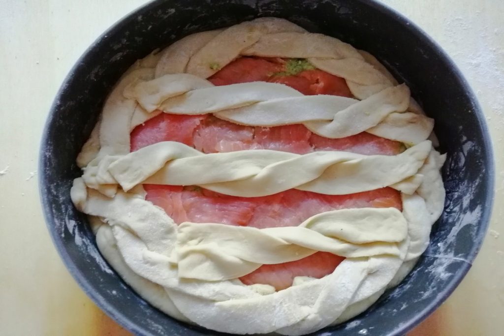Mijn hartige taart met courgettecrème en zalm heeft geen zanddeegbodem, maar is een zacht gerezen deeg, de courgettevulling heb ik van tevoren bereid en daarna ingevroren, een uitstekende methode om tijd te besparen.