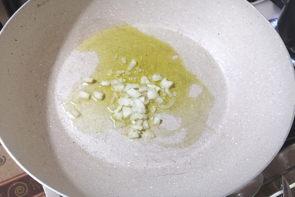 In een pan gieten we wat extra vierge olijfolie en de fijngesneden ui, en laten deze zachtjes smoren.