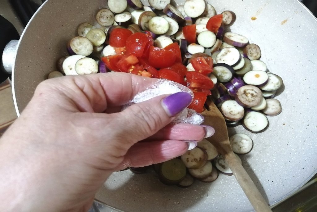 Laat 10/15 minuten koken, af en toe roeren, indien nodig voeg een scheutje water toe tijdens het koken, aangezien dit type aubergine niet waterig is.