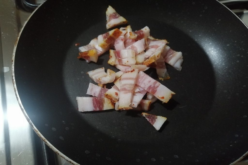 Na het koken van de aubergines, doen we de spekblokjes in een anti-aanbakpan en laten ze zonder olie roosteren.