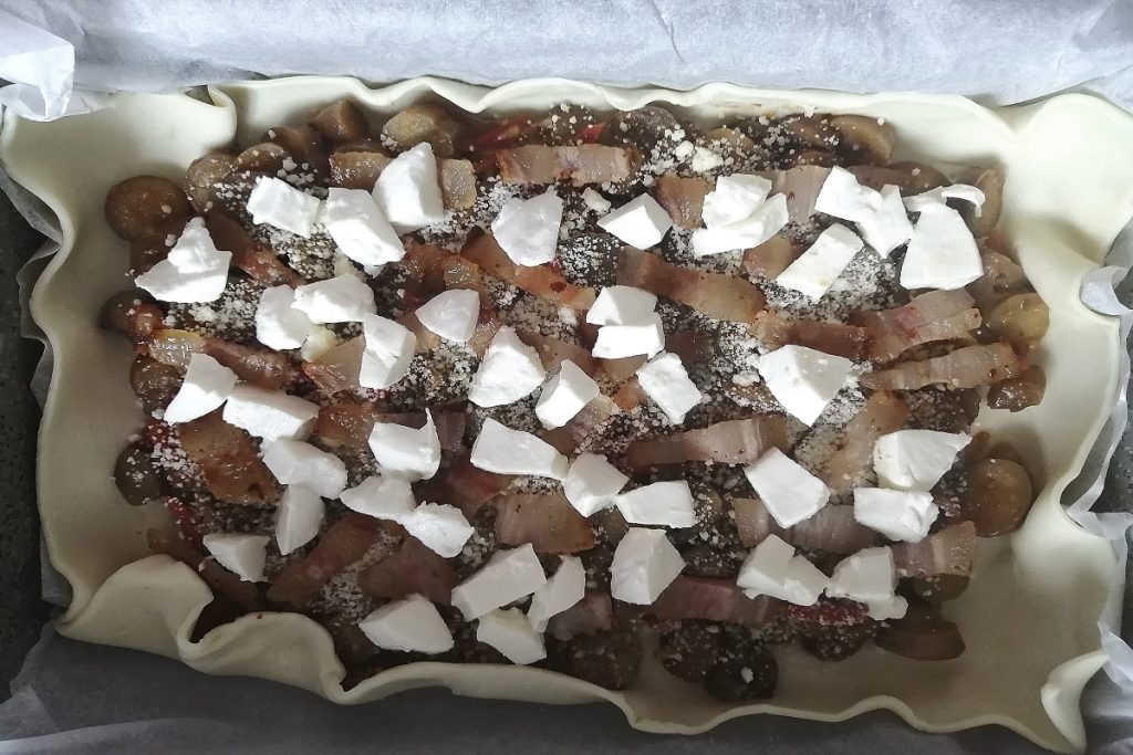 We maken het af met de toegevoegde gebruinde spekjes en de in blokjes gesneden mozzarella.