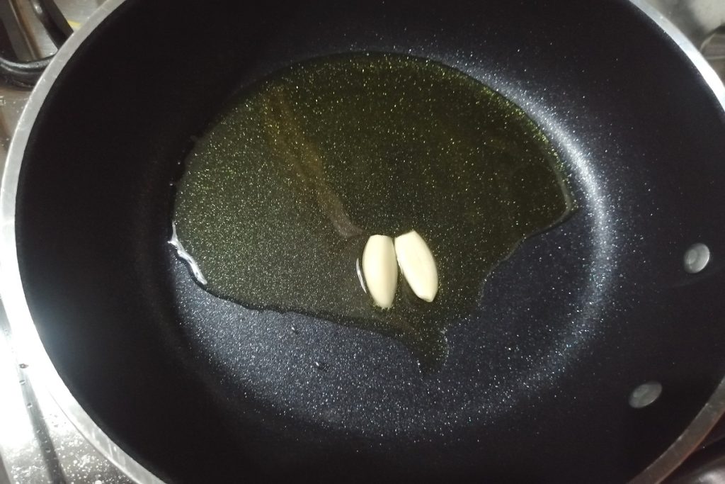 We zetten een pan op het fornuis met wat olie en een teentje knoflook.