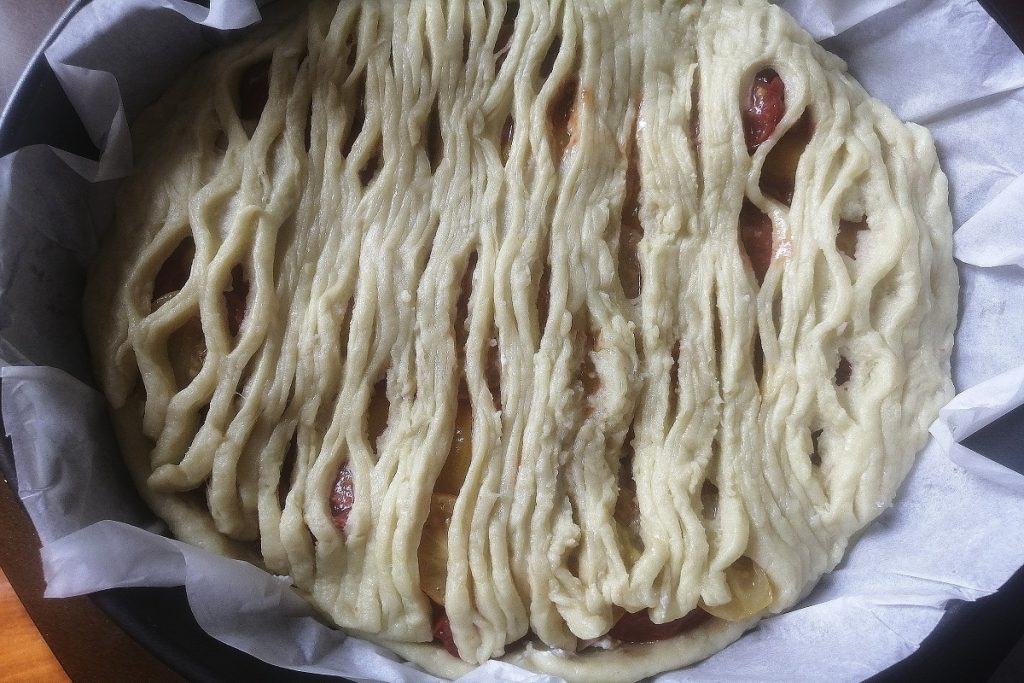 We rollen het resterende deeg uit om de hartige taart te bedekken.