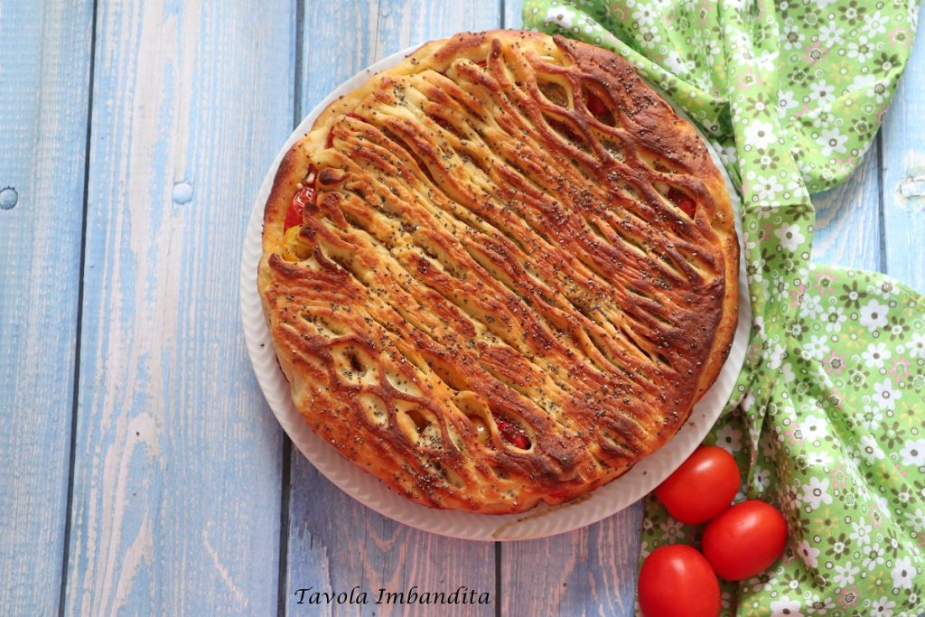 De hartige taart met ricotta en gele en rode cherrytomaatjes is perfect voor uw picknicks in de bergen, uw vrienden zullen er dol op zijn.