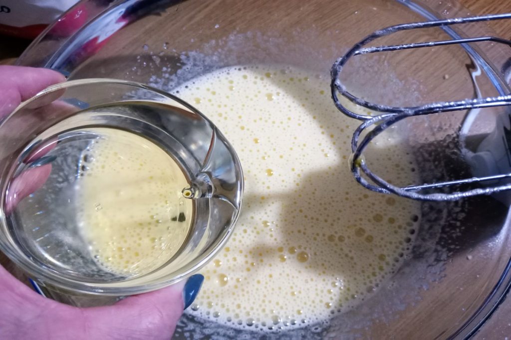 • Voeg de olie en het potje yoghurt toe, terwijl je blijft mixen met de garde.