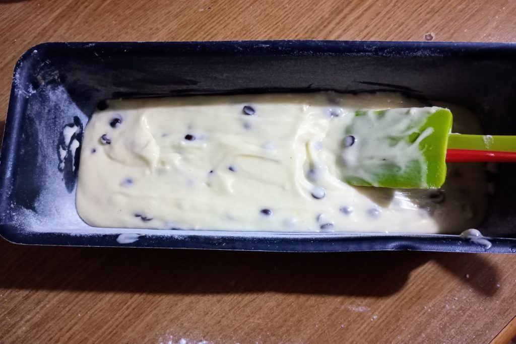 • Giet de helft van het deeg in de ingevette en met bloem bestoven plumcakevorm.