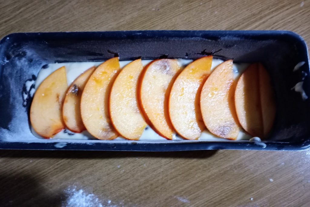 Ik heb de kaki persimon gebruikt, die een stevige, compacte en zoete textuur heeft, ik sneed hem in dunne plakjes en voegde hem halverwege en bovenop de plumcake toe voordat deze de oven in ging.