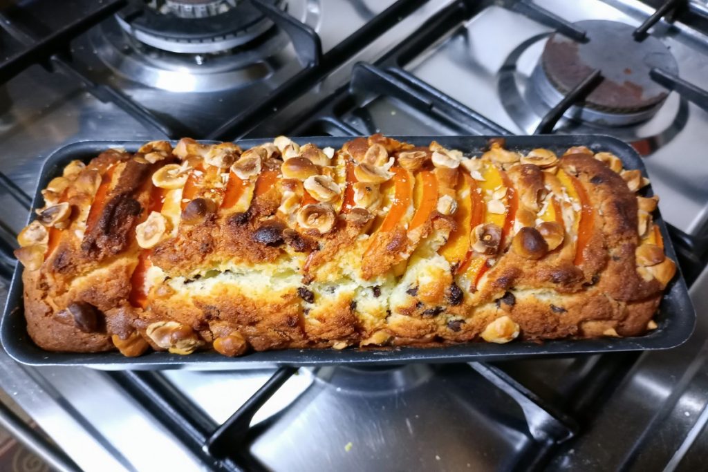 kaki-plumcake met chocoladedruppels en hazelnoten