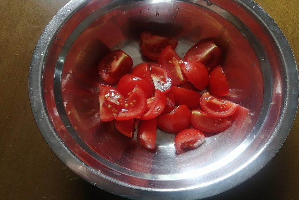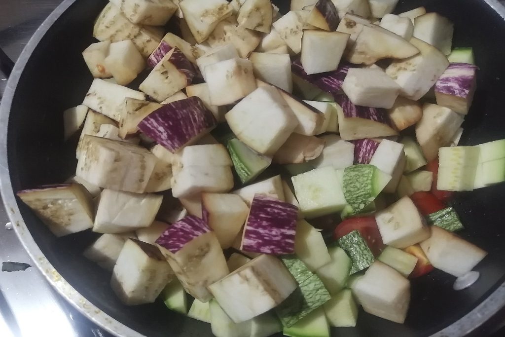 Was de cherrytomaatjes en snijd ze in vieren. Ga verder met de groenten door de courgette en aubergine in blokjes te snijden.