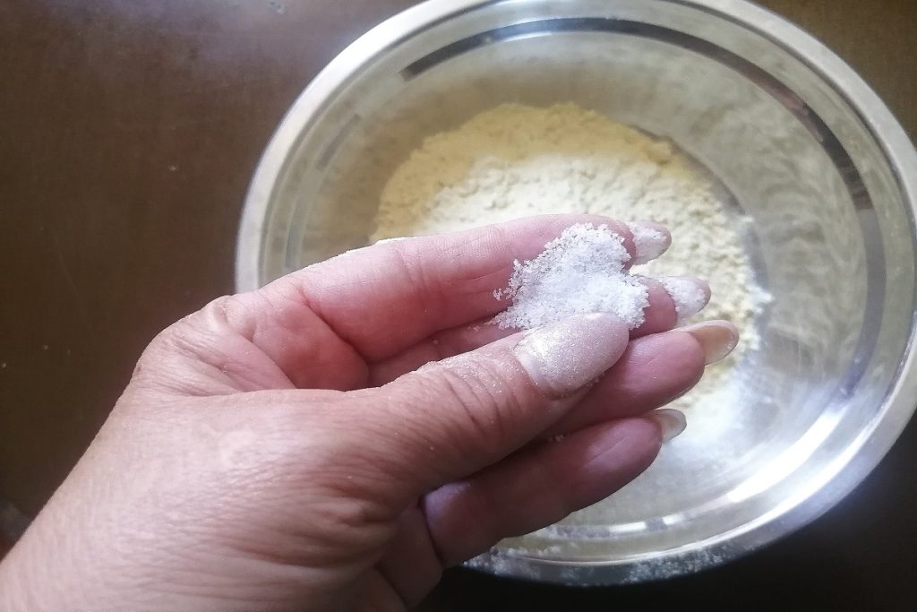 Ga verder met het bereiden van de gnocchi: doe wat zout bij het kikkererwtenmeel, voeg het water toe en kneed tot een homogeen deeg.
