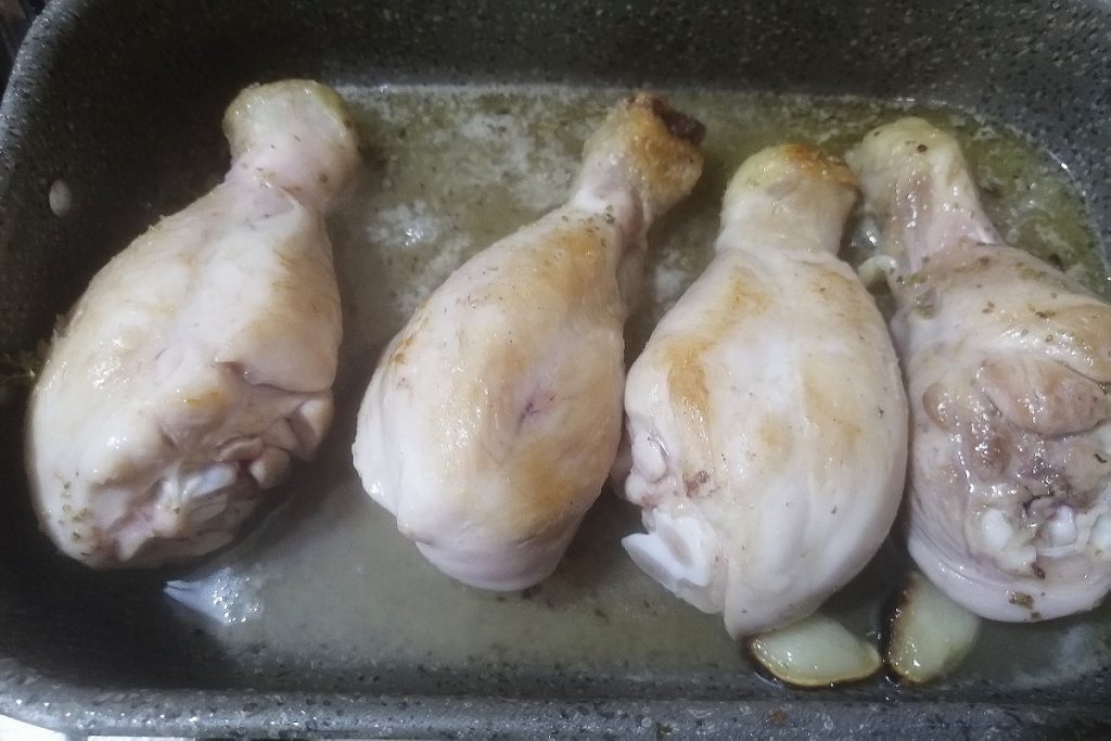 De kippenbouten met Tropea-ui en Taggiasca-olijven worden 20 minuten op het fornuis gekookt, waarbij ze eerst op hoog vuur worden gebakken en vervolgens verder worden gekookt met de witte wijn.
