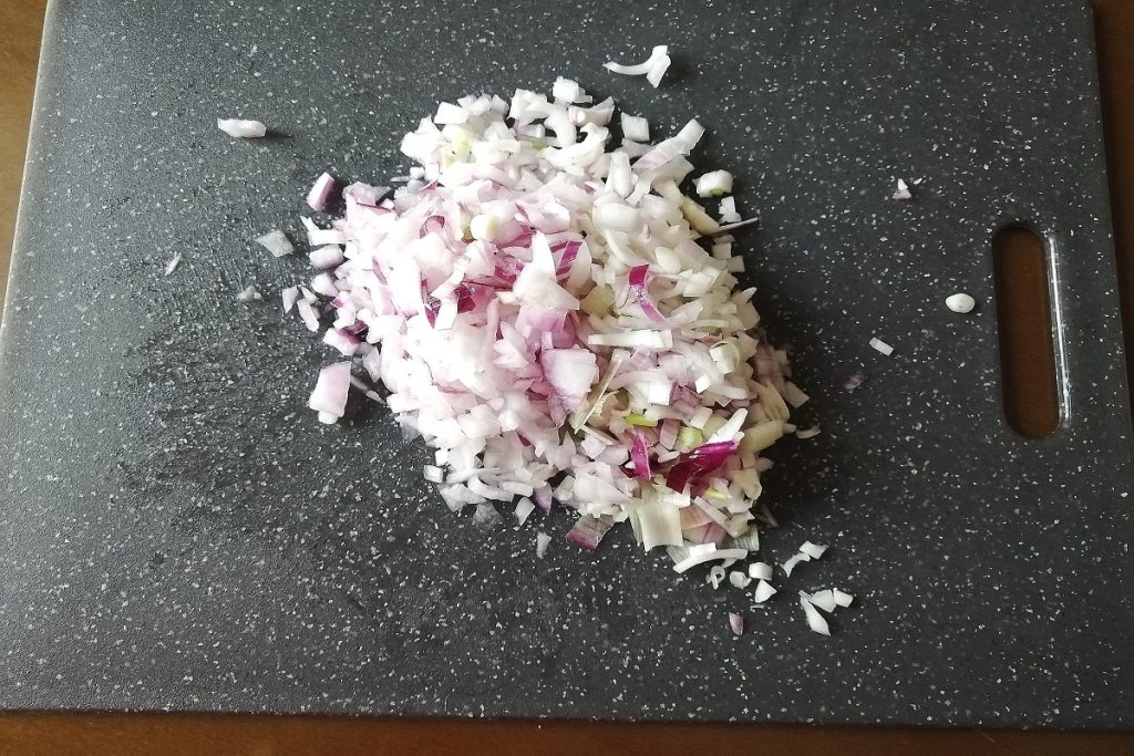 We beginnen met het bereiden van de groenten, door de lente-uitjes schoon te maken en fijn te snijden.