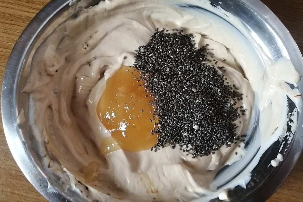 Giet de yoghurt in een kom en meng deze met het kopje espresso; voeg honing en chiazaad toe en meng alle ingrediënten goed door.