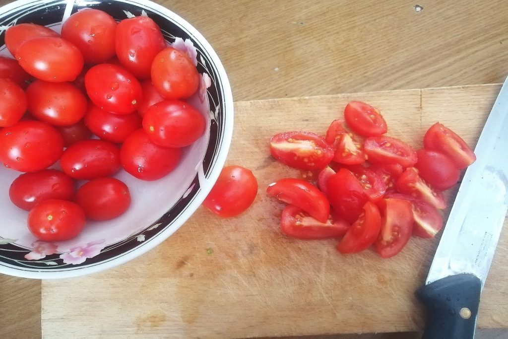 We gaan verder met de tomaatjes, we wassen ze en snijden ze in kwartjes.