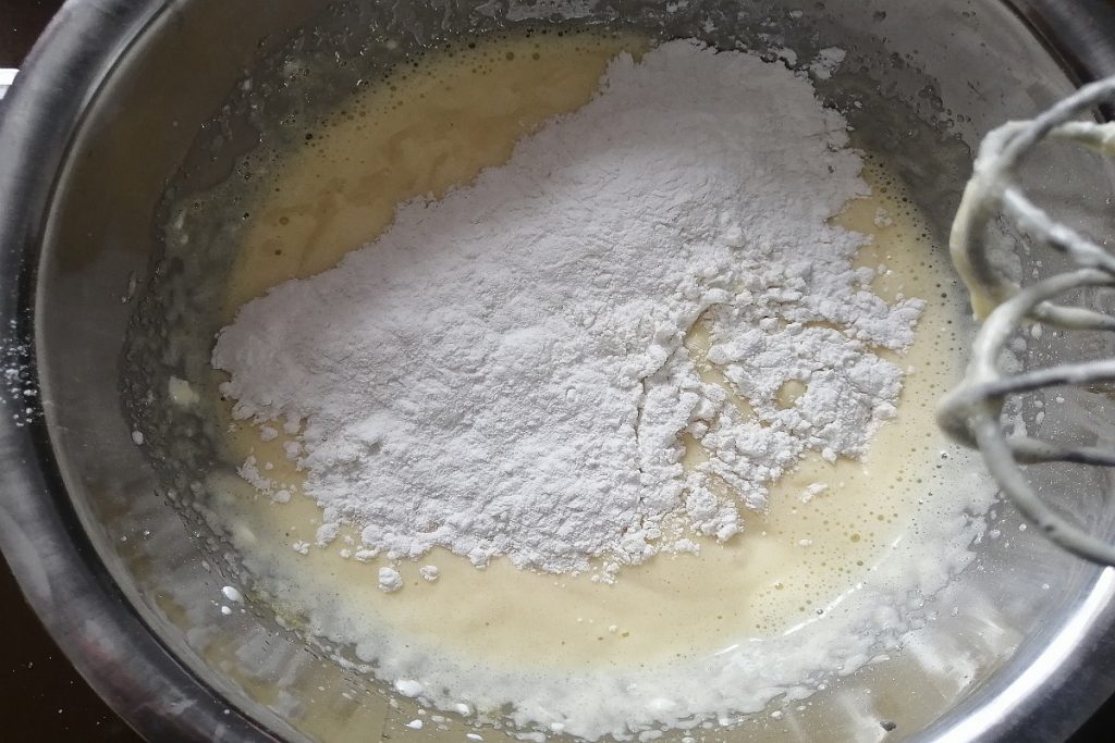 Voeg beetje bij beetje de bloem gemengd met het maïszetmeel en het bakpoeder toe.