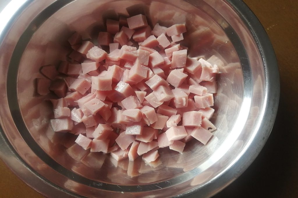 We bereiden de vulling van de frittata’s voor: de gekookte ham in kleine blokjes en de geraspte gerookte scamorza in julienne.