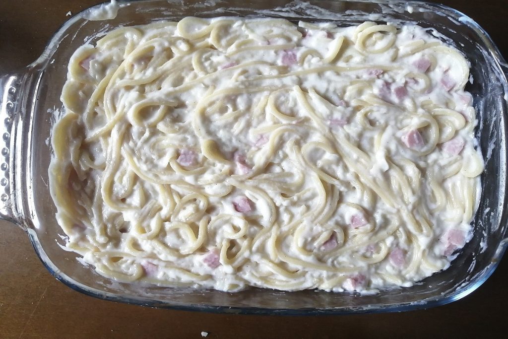 We voegen de rest van de ingrediënten toe: ham, scamorza, geraspte grana en kruiden met witte peper.