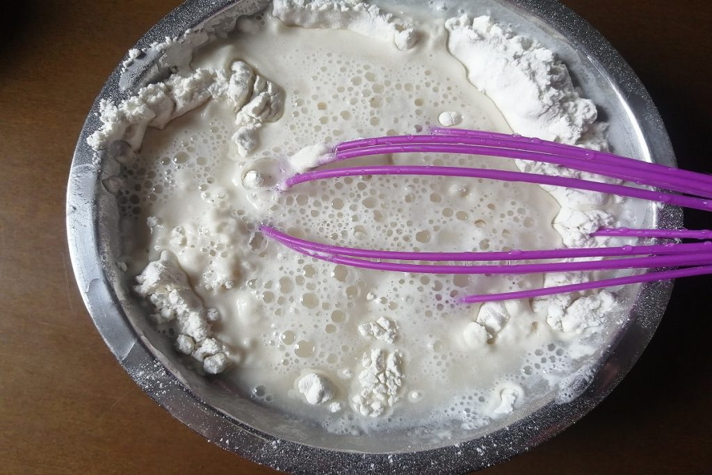 Ondertussen maken we het beslag met bloem en water en wanneer de melk kookt, gieten we het geleidelijk in de melk.