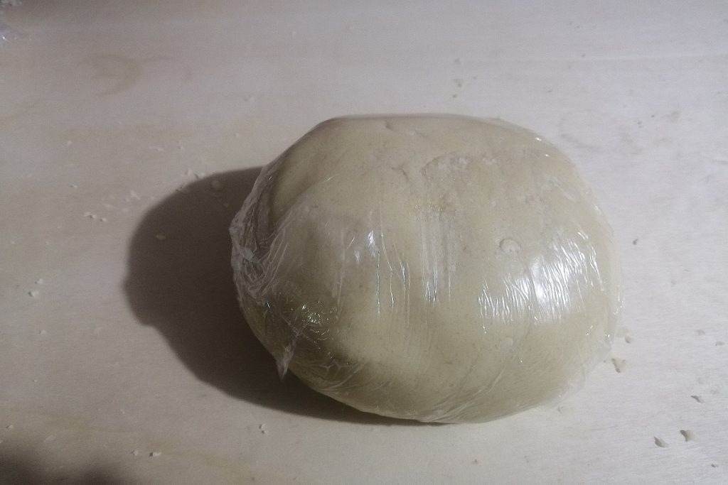 Wikkel het deeg in huishoudfolie en zet het een uur in de koelkast om te rusten.