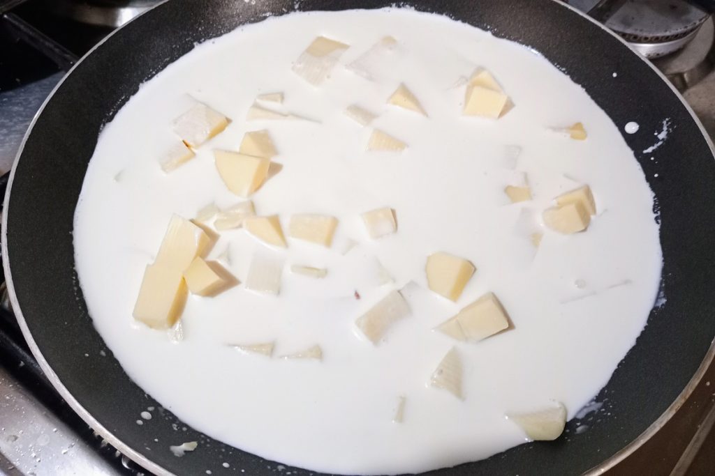Giet in een pan de verse room en voeg de kaasblokjes toe, laat ze weken om zacht te worden.