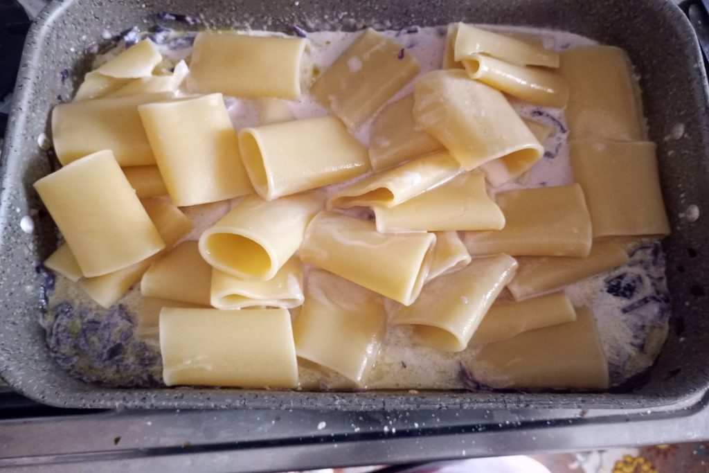 De paccheri met rode kool, speck en fontinacrème, een romig gerecht, rijk van smaak, met zijn prachtige kleur voegt het een extra waarde toe aan je tafel.