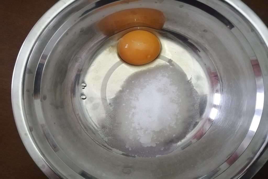 In een kom gieten we de erythritol en het ei dat we met een handgarde gaan bewerken.