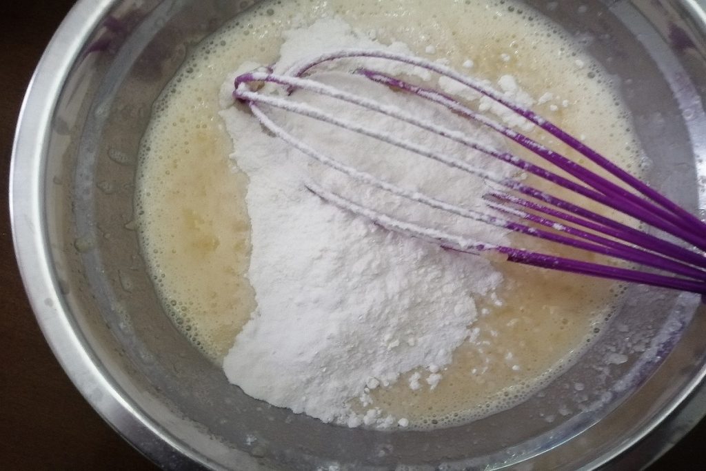 We beginnen beetje bij beetje de bloem gemengd met het bakpoeder toe te voegen en eindigen met een snufje kaneel.