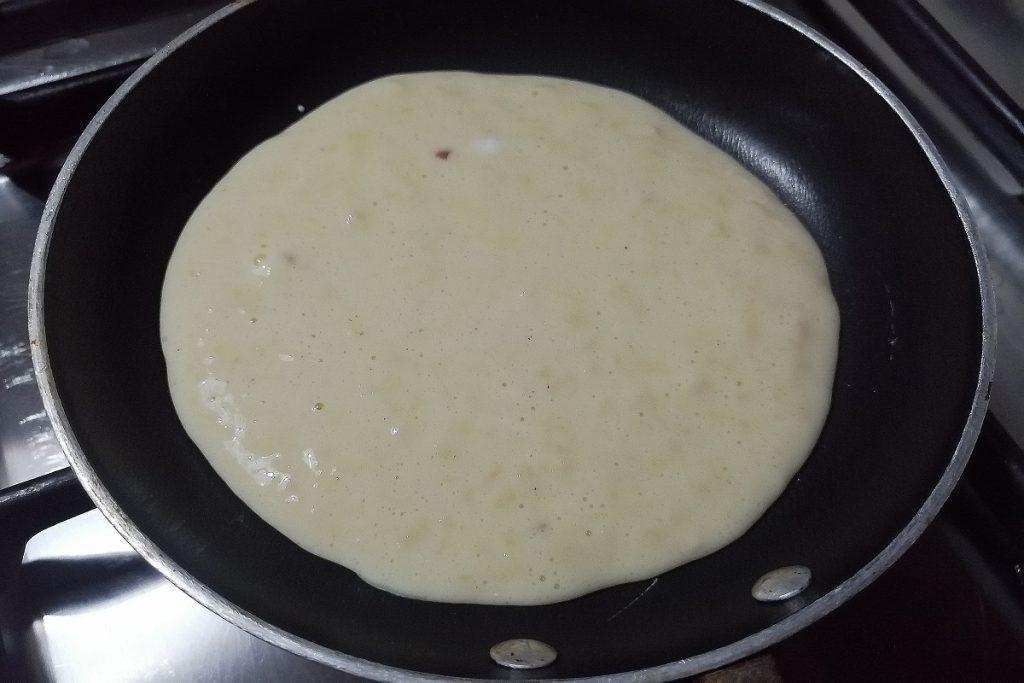 We verwarmen de pan (met een diameter van 12 cm) op laag vuur en gieten 2-3 eetlepels beslag.