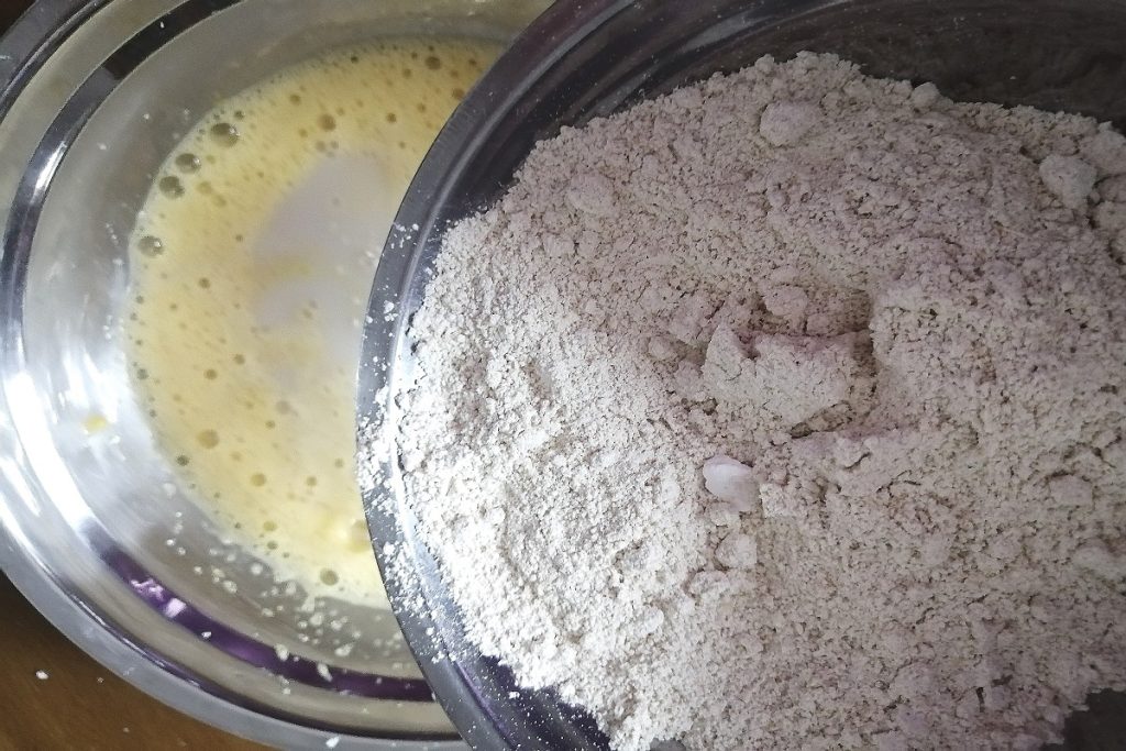 Voeg de plantaardige drank toe en het havermoutmeel gemengd met bakpoeder.