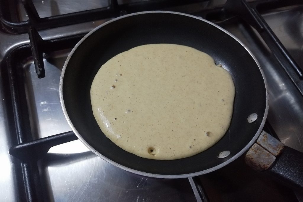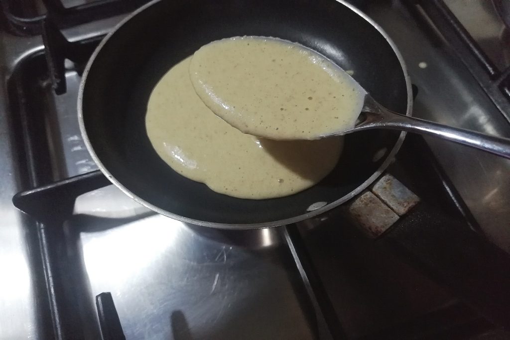 Verwarm de pan en giet twee lepels beslag erin; bak op laag vuur, en als je ziet dat het aan het stollen is, draai de pannenkoek voorzichtig om en bak de andere kant.