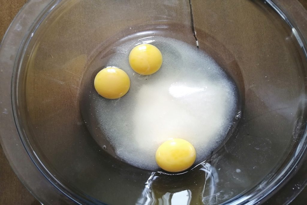 Doe in een kom de eieren en de suiker, klop ze met de elektrische mixer tot ze licht en schuimig zijn.