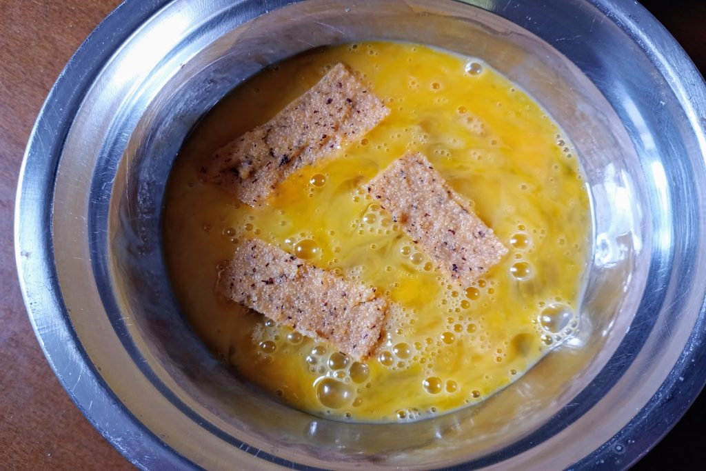 Klop de eieren met een snufje zout in een kom en dompel de polenta sticks erin, haal ze vervolgens door het paneermeel.