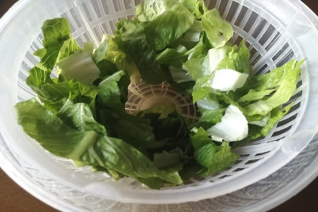 Bereid ondertussen de romaine sla voor door de beschadigde buitenste bladeren te verwijderen.