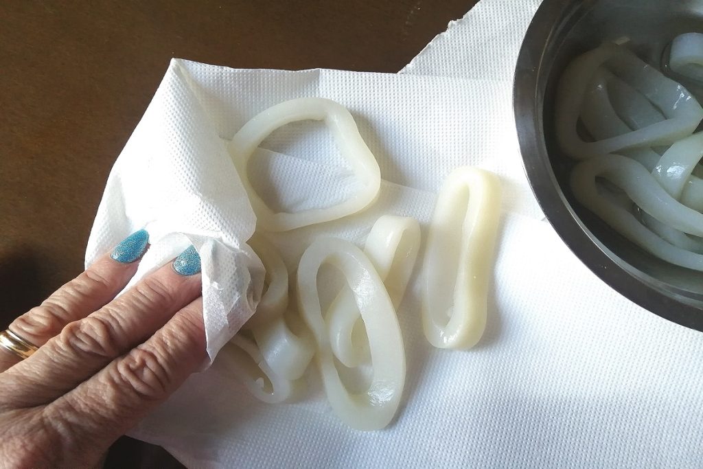 Was en droog de inktvisringen met keukenpapier en kruid ze met zout.