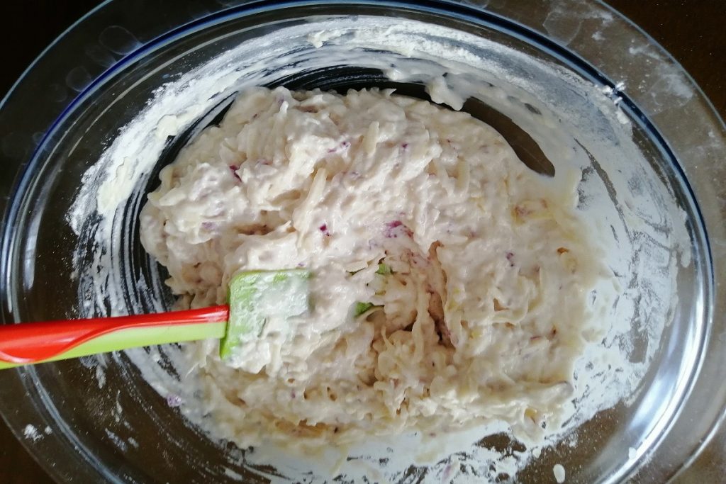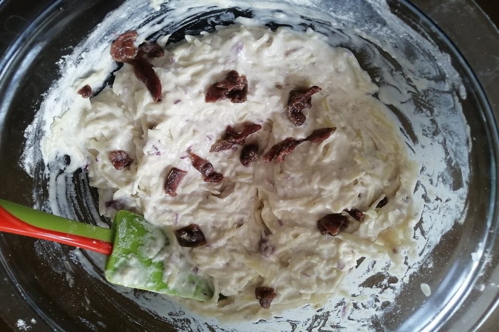 In deze taart worden de groenten gemengd met bloem en water in een kom en vervolgens in de oven zonder gist.