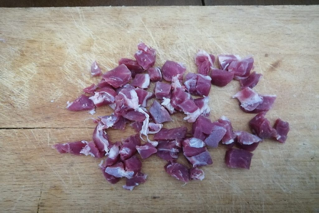 Snijd de rauwe ham in blokjes en probeer zoveel mogelijk vet te verwijderen.