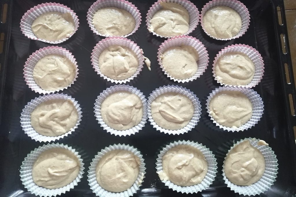 Plaats de cakevormpjes in de muffinvorm en vul ze voor 3/4, rekening houdend met de rijzing tijdens het bakken.