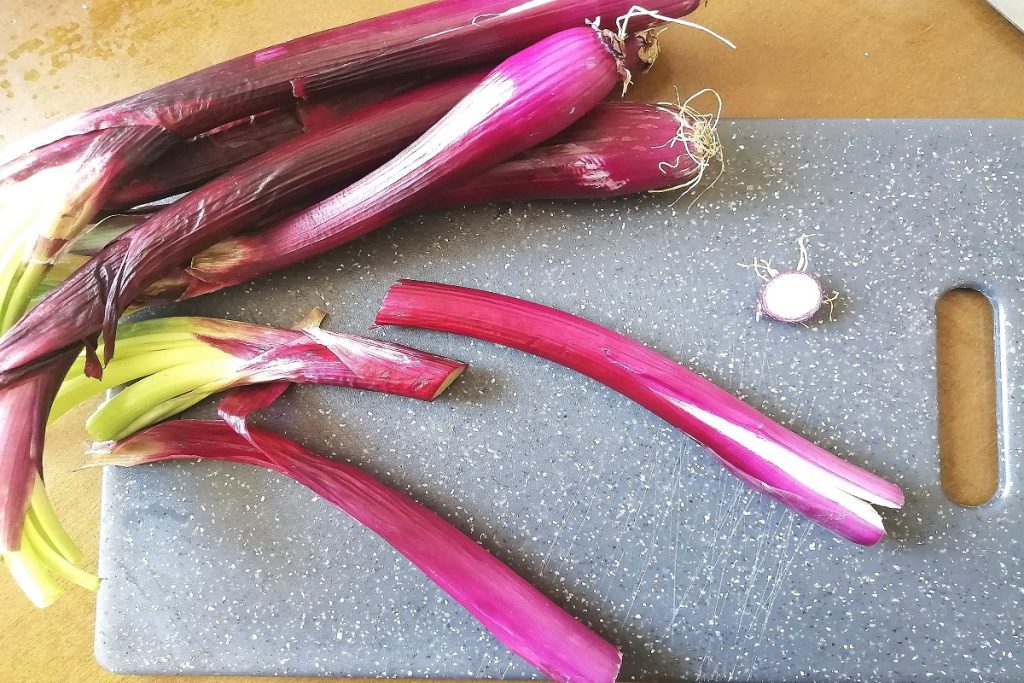 Maak de verse Tropea-uitjes schoon en snijd ze in de lengte.