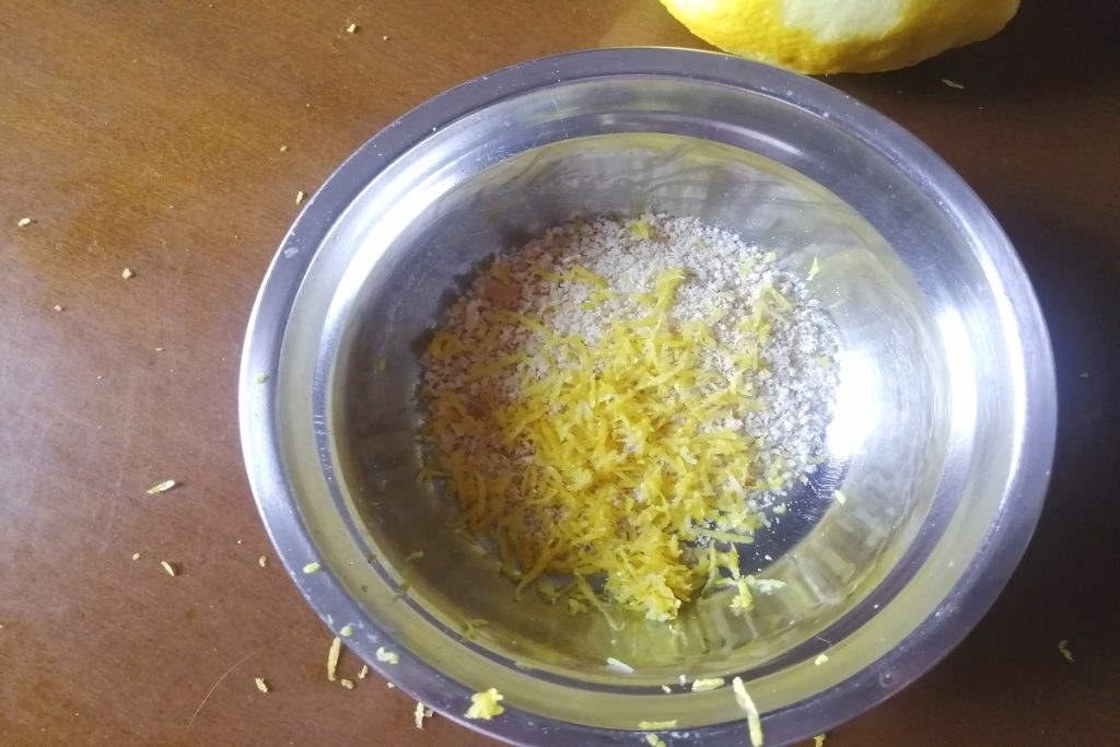 In een kom doen we het broodkruim en raspen we de schil van de biologische citroen erin.